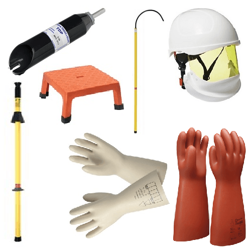 Lot d’accessoires de sécurité: vérificateur pneumatique, coffret à gants avec flacon poudreur, paire de gants latex Classe 3, tabouret isolant, perche de sauvetage, perche de VAT + VAT, éclairage de sécurité à leds, pancarte de prescriptions de sécurité, pancarte de prescriptions générales, pancarte de soins aux électrisés, pancarte travaux électriques hors-tension, pancarte danger poste haute-tension, pancarte poste haute-tension, pancarte danger SF6 et un extincteur à poudre 2Kg